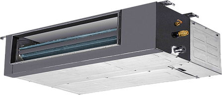 Ультратонкие канальные блоки RMS-IN…-D5/V2 имеют высоту всего 200 мм (для всех типоразмеров), что позволяет сэкономить запотолочное пространство, не занижая его значительным образом. Специально сконструированный V-образный теплообменник обеспечивает высокоэффективную теплопередачу, почти не препятствуя движению воздуха, в связи с чем блоки являются крайне тихими и комфортными (уровень шума 24 дБ(А) для моделей 1,8 ~ 2,8 кВт на низкой скорости вентилятора) и их возможно применять в тихих зонах, таких как спальни, гостиничные номера и т.д.